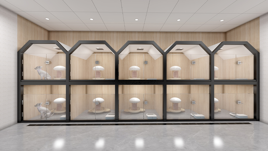 采用可移動(dòng)隔斷與多功能家具系統(tǒng),靈活劃分活體展示區(qū)、美容SPA區(qū)、寄養(yǎng)艙及零售區(qū)。例如,犬類活動(dòng)區(qū)配備智能防撞護(hù)欄與自動(dòng)喂食系統(tǒng),貓柜集成恒溫恒濕新風(fēng)模塊,確保寵物舒適度。