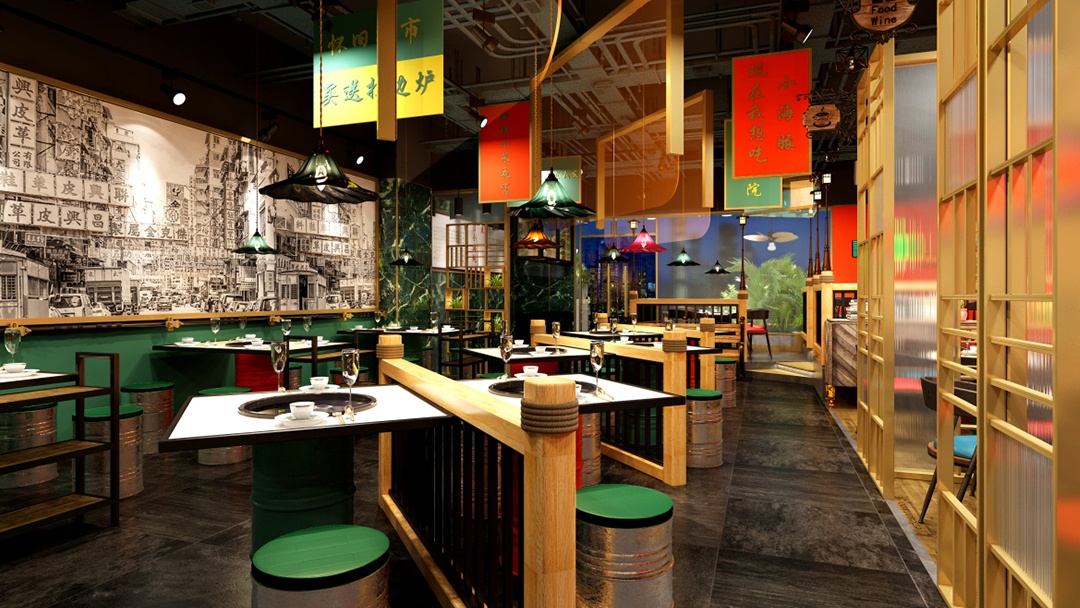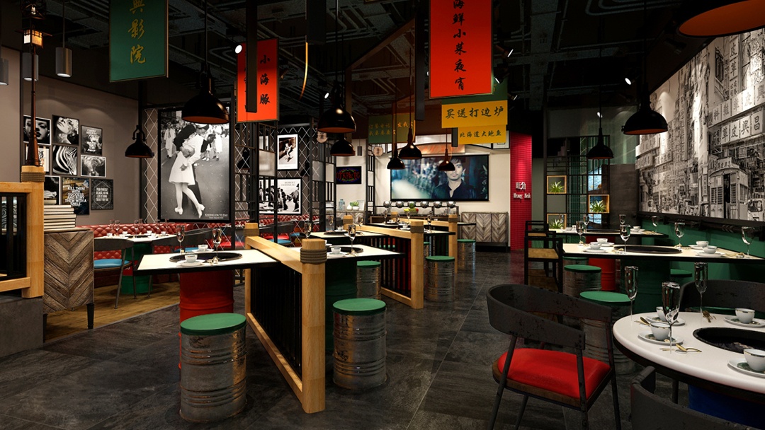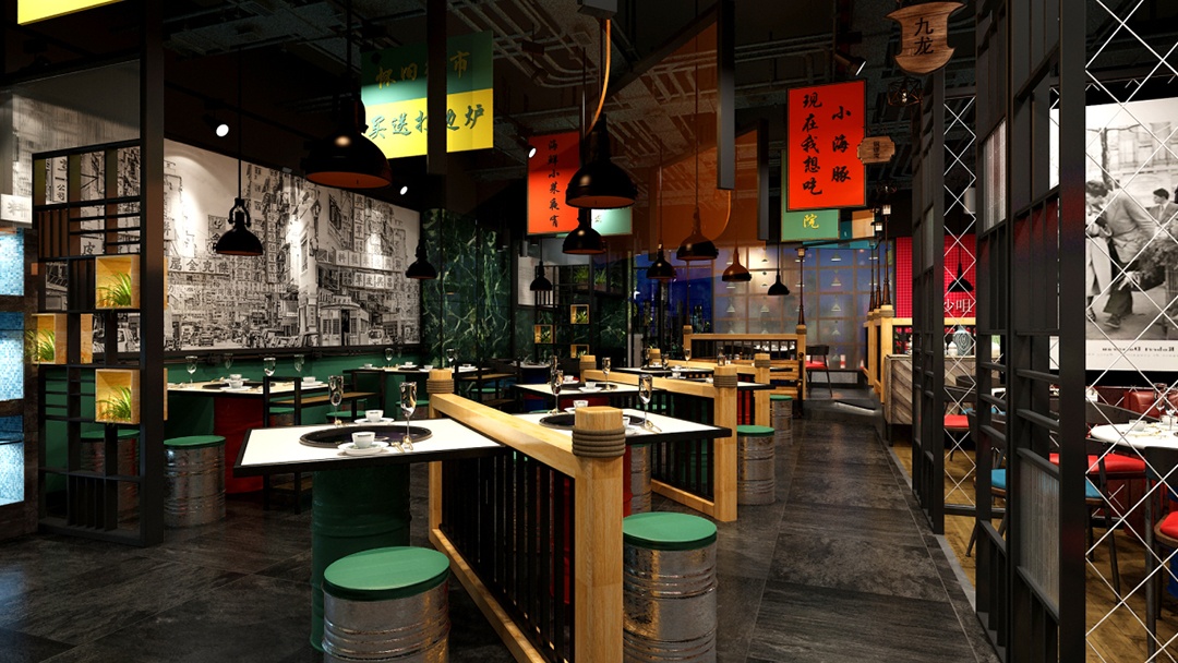 杭州懷舊風(fēng)火鍋店裝修設(shè)計(jì)中,為了營(yíng)造出簡(jiǎn)約、隨意、懷舊,且具有煙火氣息的用餐環(huán)境。同時(shí),明確傳達(dá)出“價(jià)格平民”的訊息,吸引喜愛(ài)這種風(fēng)格的顧客,前來(lái)體驗(yàn)。我們?cè)趬γ嫔?,張貼具有年代感的大字報(bào)和老照, 展示過(guò)去市井生活的場(chǎng)景,如老街巷、老火鍋店等,喚起顧客的懷舊情感。并利用廢舊的大鐵桶,改造成獨(dú)特的椅子,既體現(xiàn)了環(huán)保理念,又增加了空間的工業(yè)風(fēng)格元素。頂面,巧妙懸掛手寫(xiě)主打菜名,和優(yōu)惠活動(dòng)牌子。既吸引顧客注意,又能增添一絲文化氣息。