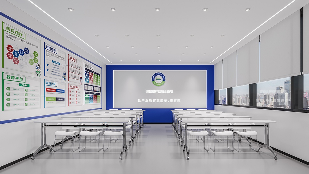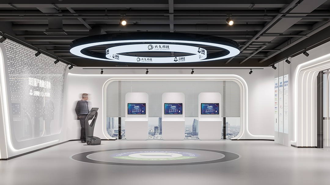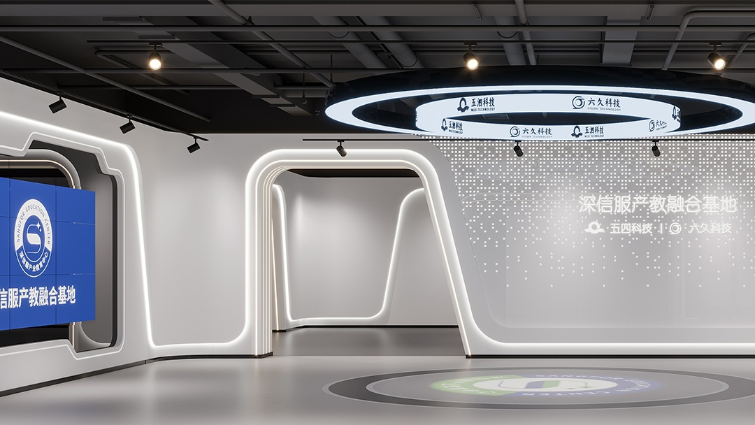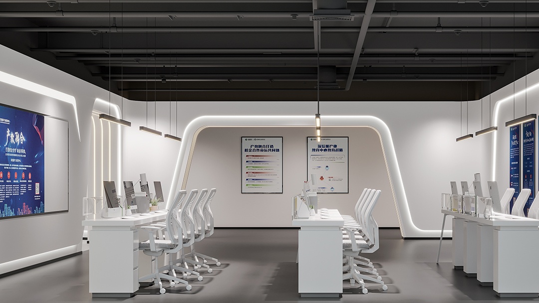 杭州科技展廳裝修設(shè)計,以簡潔白為主色調(diào),開啟一場科技與美學(xué)的對話。純凈的白色墻面與地面,營造出開闊、明亮,且極具未來感的空間氛圍,讓參觀者仿若置身科技純凈之境。藍(lán)色,作為點(diǎn)綴色巧妙融入,從展示設(shè)備的邊框到指示標(biāo)識,藍(lán)色線條與光影交織,為簡潔空間注入靈動與科技活力,凸顯科技產(chǎn)品的創(chuàng)新與智慧。裸頂噴黑處理,堪稱點(diǎn)睛之筆,工業(yè)風(fēng)的粗獷與整體簡潔風(fēng)形成反差又完美融合,專業(yè)大氣之感撲面而來。搭配精心布局的燈光系統(tǒng),重點(diǎn)突出展示區(qū)域,引導(dǎo)參觀者視線。杭州科技展廳,以簡潔白藍(lán)與裸頂噴黑的獨(dú)特設(shè)計,打造出一個既具科技專業(yè)度,又富有藝術(shù)美感的展示空間。