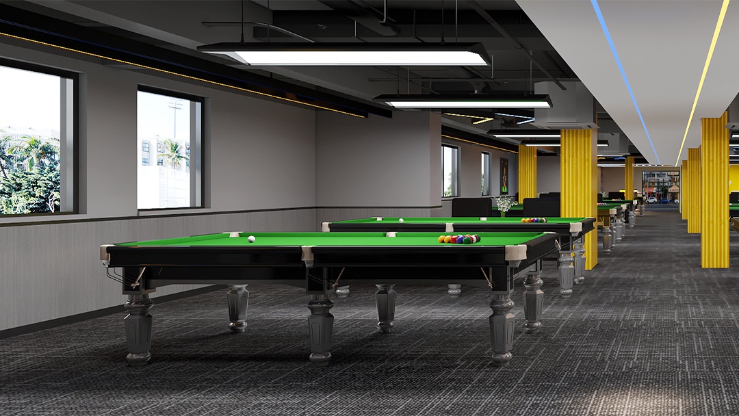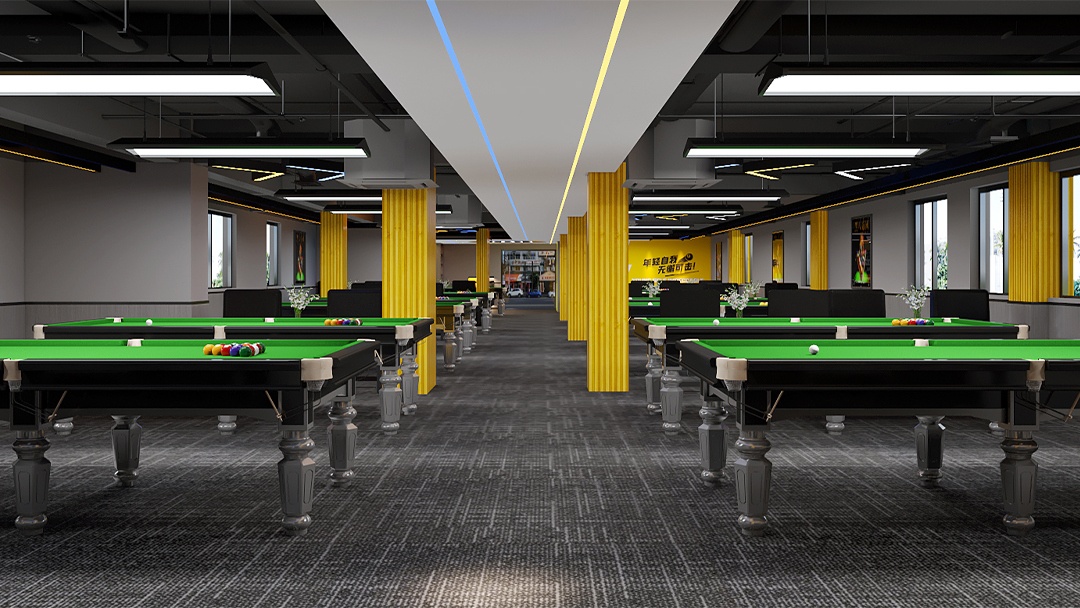 針對臺球廳需求,博妍從三大維度構(gòu)建解決方案:空間布局上,嚴格遵循行業(yè)標準,確保球桌間距1.5米以上、主通道寬度合理,實現(xiàn)比賽區(qū)、休息區(qū)、水吧等功能分區(qū)的科學動線分離;環(huán)境營造方面,采用4000K中性光LED無影燈系統(tǒng),搭配深色吸音墻面與PVC防滑地板,通過聲學優(yōu)化將噪音控制在55分貝以下;增值服務區(qū)則整合智能預約系統(tǒng)、自助結(jié)算終端及會員管理平臺,提升運營效率。