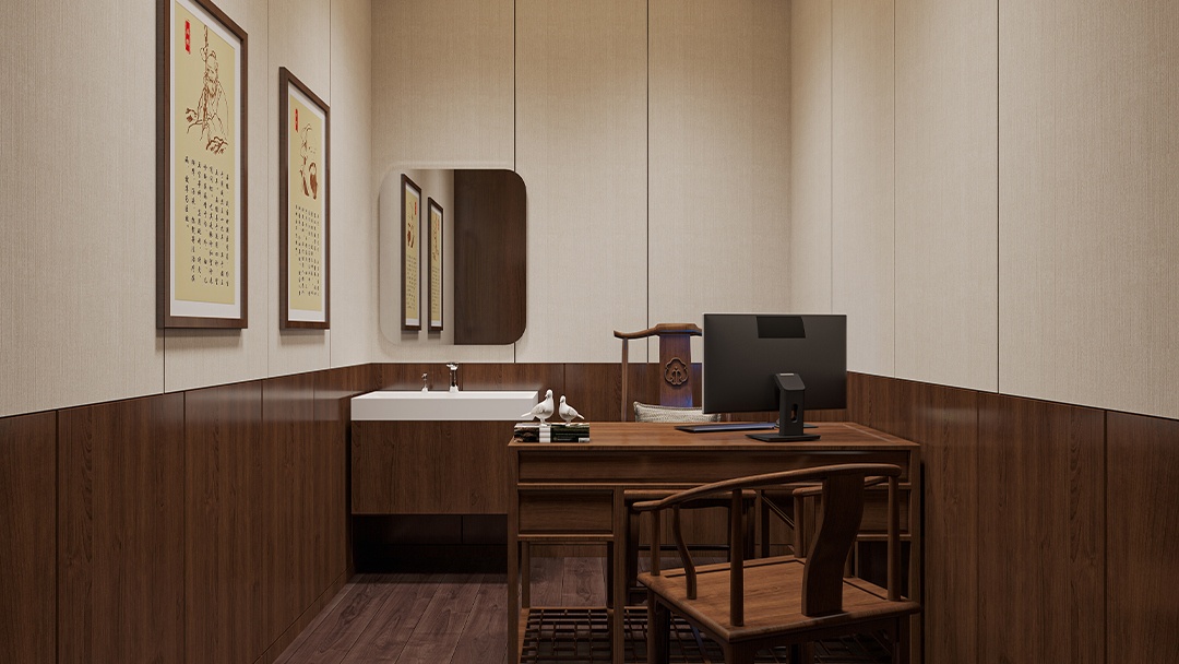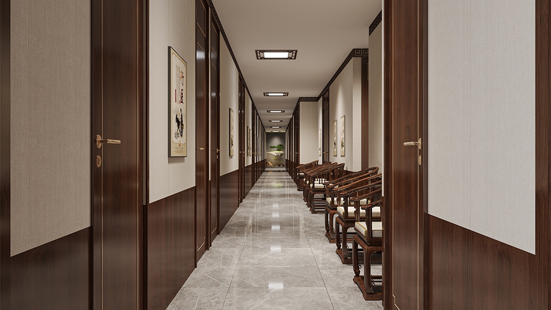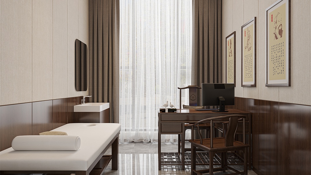 杭州智慧中醫(yī)館裝修設(shè)計(jì),構(gòu)建“人機(jī)協(xié)同”的診療環(huán)境。入口設(shè)AI面診儀與舌象采集屏,數(shù)據(jù)實(shí)時(shí)同步至醫(yī)師工作站。診療區(qū)配備智能脈診輔助設(shè)備與全息經(jīng)絡(luò)投影系統(tǒng),治療床集成紅外熱成像與穴位定位光導(dǎo)。藥材區(qū)采用智能配藥機(jī)械臂與透明溯源展示柜。整體空間以淺木色與科技藍(lán)為基調(diào),通過物聯(lián)網(wǎng)整合預(yù)約、診療、煎藥全流程數(shù)據(jù),實(shí)現(xiàn)傳統(tǒng)經(jīng)驗(yàn)與智能分析的融合呈現(xiàn)。
