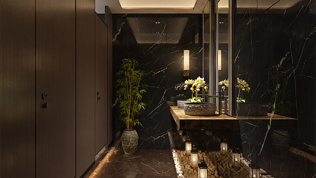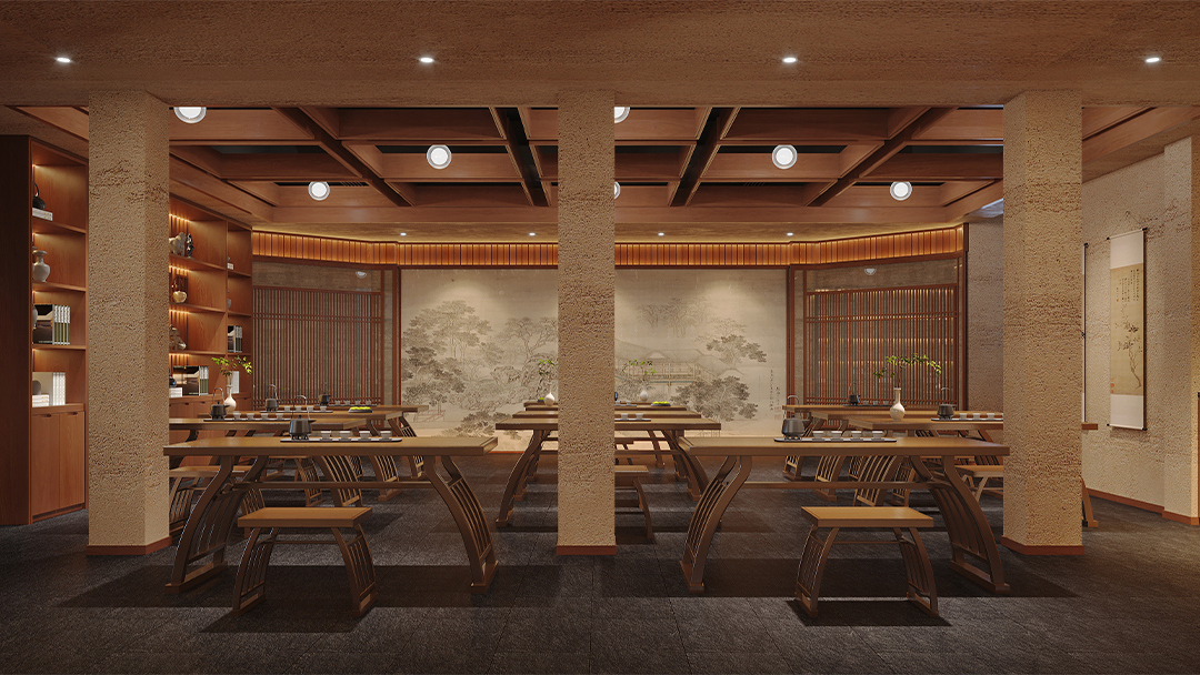 針對不同場景需求,劃分開放品茗區(qū)、私密包廂及商務(wù)洽談區(qū)。例如大廳設(shè)置可移動格柵實現(xiàn)空間靈活分隔,包間融入榻榻米茶席與獨立衛(wèi)浴,兼顧社交儀式感與實用性。 - 細(xì)節(jié)處的文化敘事
