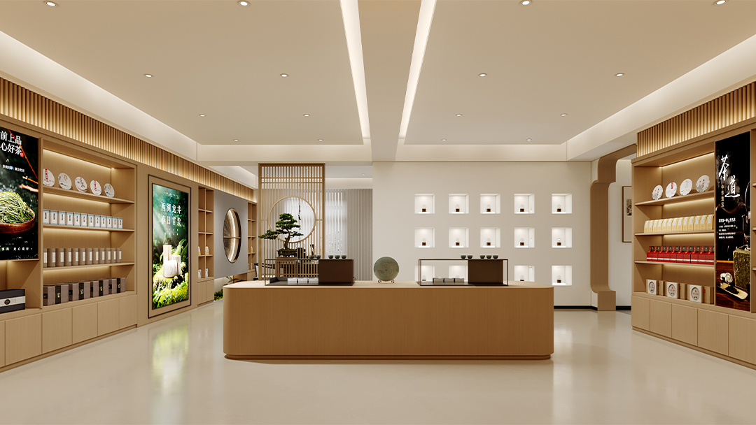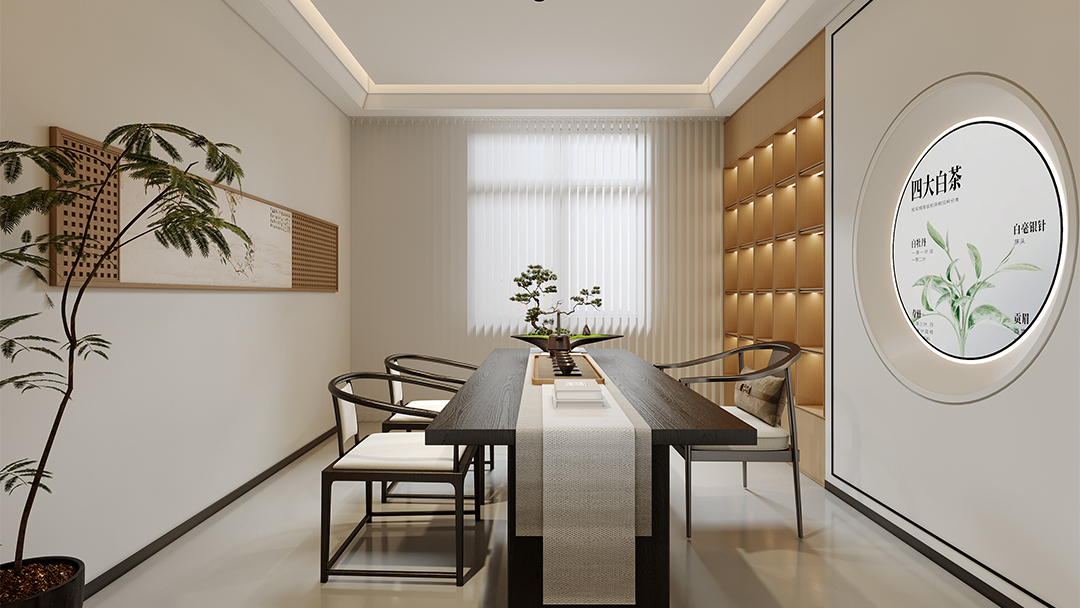 從定制手作陶器展示柜到水墨紋巖板墻面,再到嵌入式線性燈帶勾勒的建筑輪廓,每一處陳設既保留傳統(tǒng)基因,又通過極簡線條與幾何結構賦予當代藝術張力。