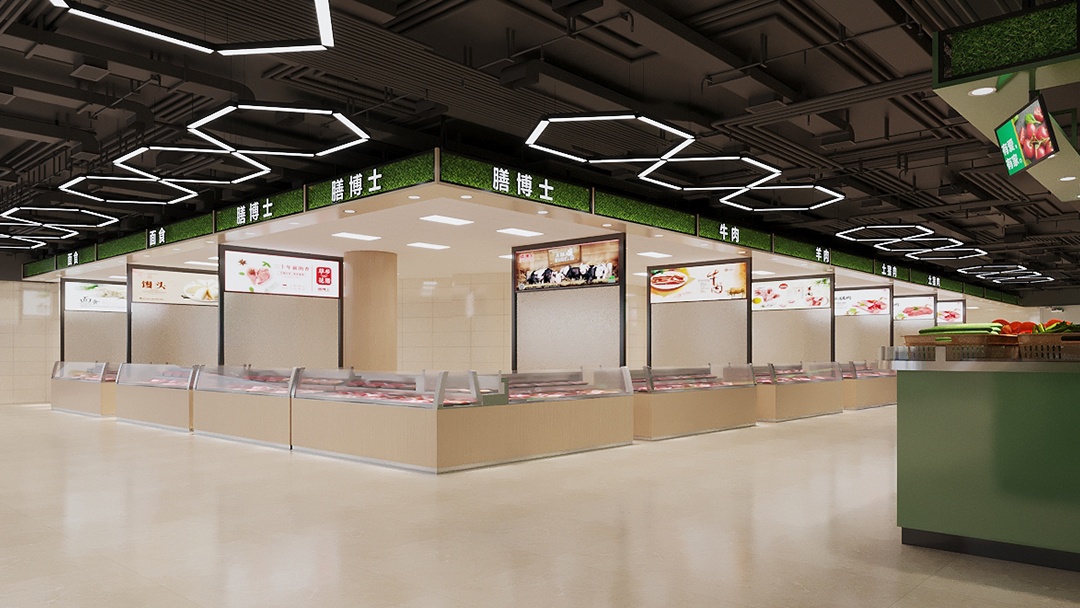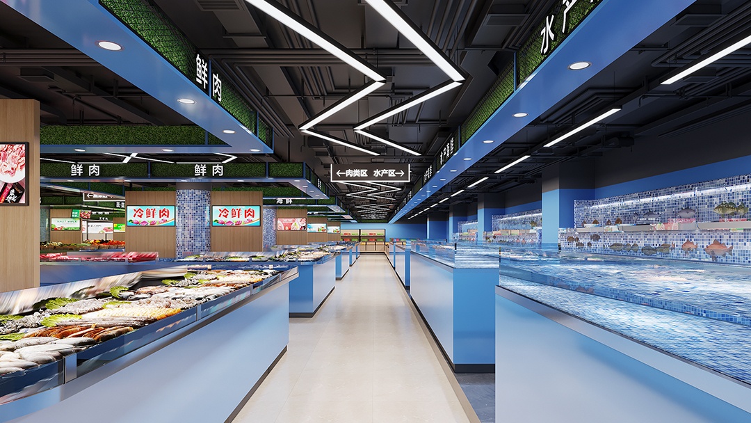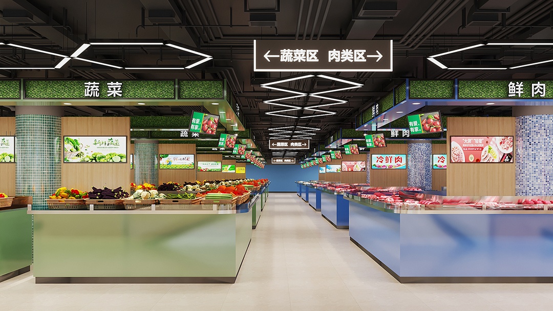 杭州生鮮超市裝修設(shè)計(jì),巧妙運(yùn)用色彩分區(qū),以藍(lán)色勾勒生鮮區(qū),綠色暈染蔬果區(qū),打造出別具一格的購物空間。踏入生鮮區(qū),靜謐而深邃的藍(lán)色調(diào)撲面而來,營造出海洋般的清涼氛圍。冷柜、展示架皆以藍(lán)色為主,與各類鮮活的海鮮、肉類相互映襯,凸顯品質(zhì)與新鮮。移步蔬果區(qū),清新的綠色瞬間讓人心曠神怡。生機(jī)勃勃的綠植裝飾與翠綠的蔬果相得益彰,仿佛置身于田園之中。合理的陳列布局,讓每一顆果實(shí)、每一把蔬菜都能盡情展現(xiàn)其飽滿姿態(tài)。藍(lán)綠交織的設(shè)計(jì),不僅為顧客帶來視覺上的享受,更引導(dǎo)著購物動線。在這里,每一次挑選都是與自然的親密對話,開啟一場鮮活、健康的購物之旅。