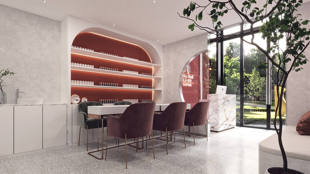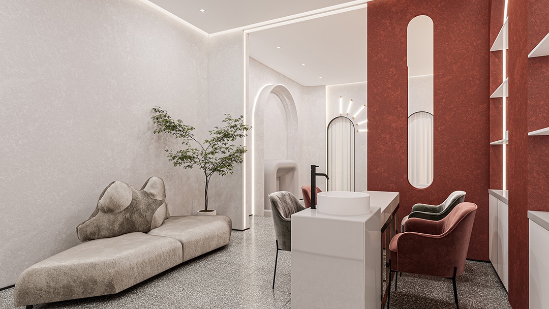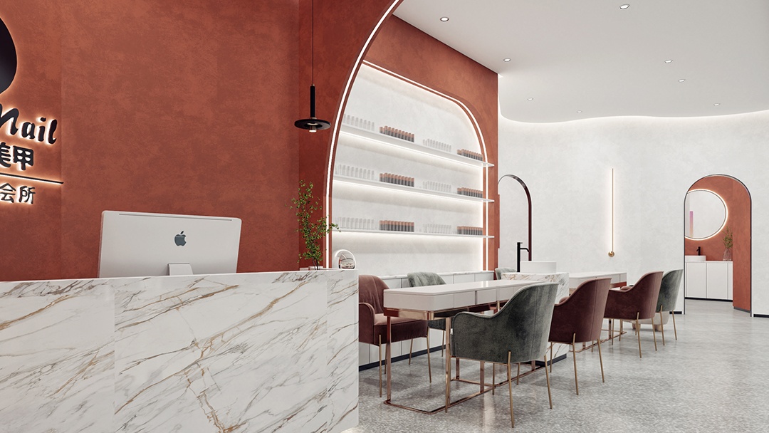 杭州韓系美甲店裝修設(shè)計(jì),以熾烈紅韻,勾勒精致美學(xué)空間;打破常規(guī),詮釋熱情與優(yōu)雅的碰撞美學(xué)。設(shè)計(jì),以“熾烈與精致”為核心,選用深紅、酒紅等層次豐富的紅色系墻面,搭配金屬線條勾勒輪廓,營(yíng)造出高級(jí)感與視覺張力并存的氛圍,瞬間抓住顧客目光??臻g焦點(diǎn),落于定制大理石臺(tái)面——潔白底色上流淌著天然灰紋,冷冽質(zhì)感與紅色背景形成鮮明對(duì)比,既凸顯美甲操作的精致感,又便于清潔維護(hù)。開放式美甲區(qū),以紅色高腳椅搭配智能補(bǔ)光鏡,滿足社交分享需求;私密包間,則通過(guò)紅色絨簾與暖光燈帶,打造沉浸式變美體驗(yàn)。細(xì)節(jié)處融入韓式簡(jiǎn)約裝飾,如幾何造型擺件、抽象藝術(shù)畫,讓空間在熱烈中不失格調(diào),成為杭州美甲界的潮流新地標(biāo)。