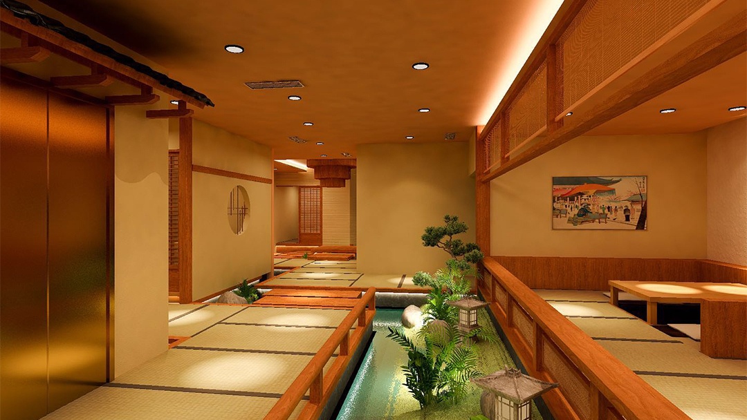 • 材質(zhì)與氛圍:選用原木、竹編、素色涂料等天然材料,搭配暖黃燈光與庭院枯山水造景,營(yíng)造靜謐雅致的用餐環(huán)境。